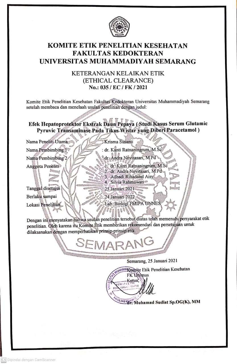 EFEK HEPATOPROTEKTIF EKSTRAK DAUN PEPAYA (Carica Papaya L): STUDI KADAR Serum Glutamic Pyruvic Transaminase (SGPT) PADA TIKUS WISTAR YANG DIBERI PARACETAMOL